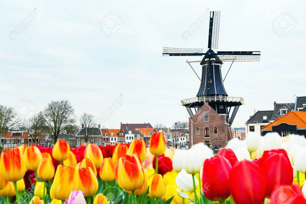 Next Image Picturesque morning landscape with the windmill, Haarlem, Holland Holland landscape with tulips and windmill, Haarlem